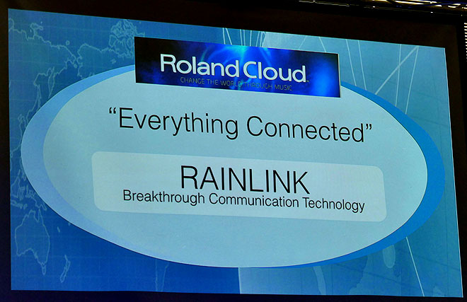発表会のラストには、NAMMで発表された新たなサービス「Roland Cloud」とコミュニーケーション技術「RAINLINK」が紹介された。Roland Cloudに登録すれば、月額制でACB PLUG-OUTシンセを使用可能。さらに8TBの容量の高解像度ソフトシンセの新シリーズにもアクセスできる。膨大な容量のソフトシンセはダウンロード不要。ユーザーの持つ電子楽器で演奏したデータをRAINLINKテクノロジーにより高解像度データで手元のデバイスに保存し、Roland Cloudにアップロード、クラウド上でレンダリングすることで高解像度のオーディオデータに変換し、手元にダウンロードできるという。今後発表されるRAINLINK対応のハードウェアやクラウドレンダリングの手法を用いることで、作曲家やゲーム音楽のクリエイターなど、DAWやソフトのユーザーの表現の幅を拡げ、クリエイティブなコントロール方法やかつでないレベルのリアルさを実現できるとのこと。日本でのサービス開始が楽しみなサービスだ。