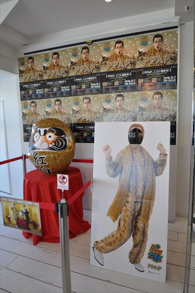 店内外にはピコ太郎の装飾が施され、昨年末の紅白出演を記念してプロデューサーの古坂大魔王と共に目を入れたヒョウ柄ダルマも飾られている。また店内にはピコ太郎の動画や音楽がれ、顔出しパネルを設置した撮影スポット、PPAPのグッズコーナーも展開されている。