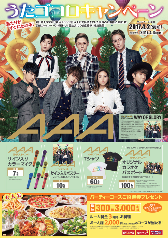 このキャンペーンでは「AAA」とコラボし、メンバーのサインが入った特製カラーマイクやポスターのほか、カラオケパスポートやパーティーコースご招待券などが抽選で当たる。