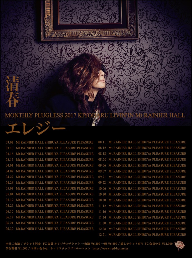 あわせて、ライブ企画<MONTHLY PLUGLESS 2017 KIYOHARU LIVIN’ IN Mt.RAINIER HALL 『エレジー』>の開催が発表された。この3月から12月まで、実に33日間のべ66回という壮大な公演数のプラグレス公演が実施され、近年の清春のライフワークとも呼べる形態のステージが存分に繰り広げられる。ロックアーティストによるアコースティックライブと聞くと、どこかサブポジションのようで、所謂ファンユース的な形態だと想像しがちだが、そんな概念を持つ人にこそこのプラグレス公演を体験することをお勧めしたい。恐らくその概念を軽く覆されてしまうようなパフォーマンス、そして想像を上回る程の彼のクリアな声と詩を耳にできるだろう。