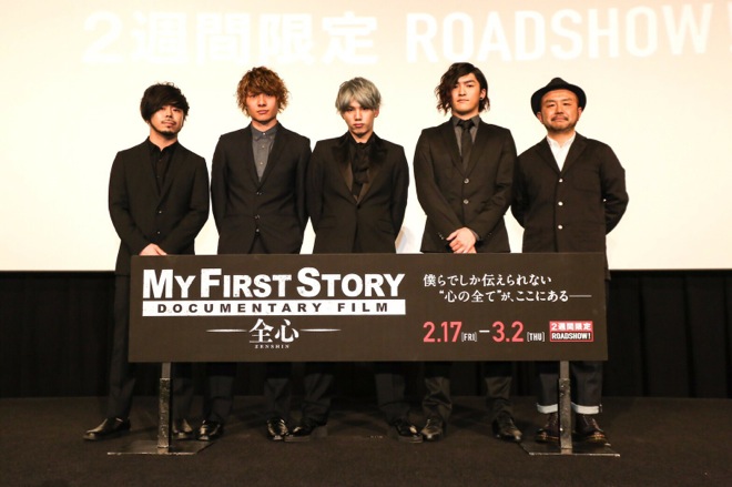 MY FIRST STORYのドキュメンタリー映画『MY FIRST STORY DOCUMENTARY FILM —全心—』の完成披露上映会および舞台挨拶が2月6日、TOHOシネマズ新宿で開催された。当日はMY FIRST STORYのHiro、Teru、Nob、Kid’zおよび木村和亮監督が登壇、客席からは大きな拍手が沸き起こった。