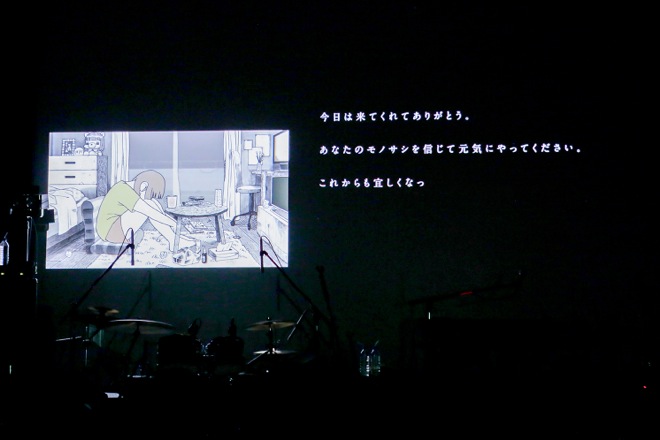 魔法が解けたかのように普段の女の子の姿に戻ったコレサワは、「どうもコレサワです。いらっしゃいませー!」と観客をおもてなし。スクリーンにMVでお馴染みの“装置”のアニメーションが流れ始めると3rd EP収録の「バックアップ」に流れ込む。スクリーン上のれ子ちゃんのシルエットとリアルに存在するコレサワがリンクし、両者の存在の強いシンクロニシティ、コレサワxウチボリシンペによって創り上げられた世界観の魅力を改めて強く感じさせた。
