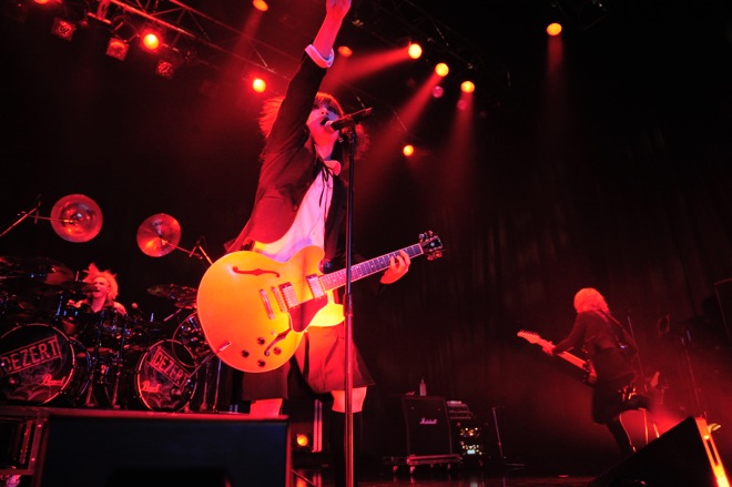 MUCCに煽られて“さぞやプレッシャーか”と思いきや、主催者でありトリを務めたDEZERTはやはり打たれ強いバンドだった。幕開けの曲はいきなり「殺意」で場内がヘドバン全開。千秋は曲の途中、逹瑯の名前を口にして“殺意殺意”と叫び倒した後に「嘘です。達瑯さん、ありがとうございます」と沸かせ、「君の子宮を触る」、「肋骨少女」と代表曲を立て続けに放つ。ぶっとく激しい演奏にもちろんフロアは大興奮。次に何が起こるか予測不可能なスリルが彼らのライヴにはつきまとう。そこが魅力だ。