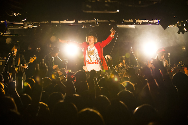 トップバッターはTHE BOHEMIANS。「ついに出れたぜ貴ちゃんナイト!」と平田ぱんだ(ヴォーカル)が高々と掲げた手には赤い時計が見える。手首に赤いものをつける、という「貴ちゃんナイト」お馴染みのドレスコードもばっちりだ。故郷山形で過ごした少年時代、中村貴子がパーソナリティを務めたラジオ番組「ミュージックスクエア」をカセットテープへ録音し、繰り返し聴いていたという平田。ラジオとロックンロールはどちらもイマジネーションをフルに使えば使うだけ面白くなるものであると熱弁し「私のR・A・D・I・O」へ。「レディオでロックンロールを聴いてここに集った仲間へ」と始めた「あういえ」では、平田の熱いMCで心がひとつになったフロアから「あういえー!」の大合唱が巻き起こった。ラストの「bohemian boy」ではなんと平田がフロアへダイブ!ステージへ押し戻されると今度はステージを飛び降り、観客と共に拳を突き上げ熱唱しながらフロアの中央まで到達すると「やったぜー!」と会心の絶叫。最後はステージと楽屋を繋ぐ花道までもシャウトしながら駆け抜け、ロックンロールパワーが漲るエネルギッシュなパフォーマンスで会場の熱気を高めていった。
