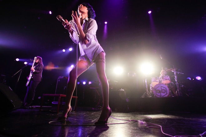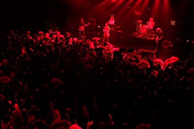 中盤では、アヴちゃんが振り向きざまに「D!I!S!C!O!」のシャウト、曲はもちろん映画『モテキ』テーマソングとして知られるキラーチューン「デスコ」だ。舞い踊るアヴちゃんが上着とスーツの下を脱ぎ去ると悲鳴のような歓声が飛び交った。オーデイエンスの沸点は、この夜の最高潮を記録。「ダイ・フォー・ディスコ・リーミックス!」のシャウトと共に四つ打ちダンスパートへクロスフェード、狂乱のダンスがさらにヒートアップしていく。その勢いのまま、ひばりくんのギターのリフが猥雑な雰囲気を醸し出すロックチューン「く・ち・づ・け」へ。