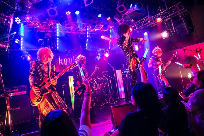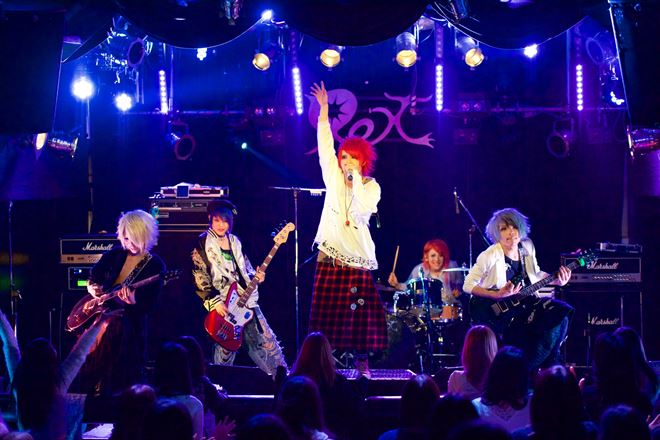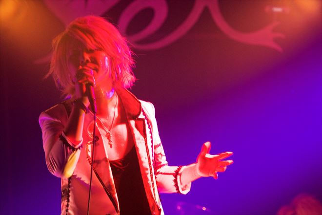 「福岡からやってまいりました、今日は一日よろしくお願いします」とステージに現れたのはAnima。九州で活躍しながらも着実に力をつけ東京への遠征も増えつつあるバンドだ。Animaの楽曲は華やかで可愛らしい見た目とは裏腹に激しく、歌詞も毒を含んでいて面白い。それでいながらしっかり恋の曲「恋愛ポーカー」の前にはシキ(Vo)が「俺たちと恋をしようか」とファンのハートをときめかせることも忘れない。トランス調の曲やパラパラを踊る振り付けなどもあり全体的に派手なステージの中でバラード「オベリスク」も披露され、25分という短い時間にも関わらず自分たちの持つすべての魅力を見せつけた。