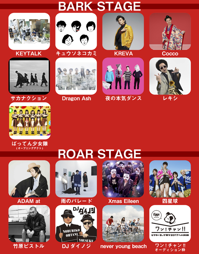 BARK STAGE出演者はKEYTALK、キュウソネコカミ、KREVA、Cocco、サカナクション、Dragon Ash、夜の本気ダンス、レキシ、そしてオープニングアクトのばってん少女隊。