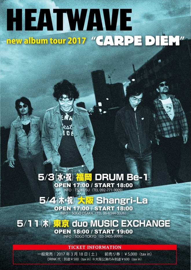 同アルバムがいち早く入手できるレコ発ツアーの開催も同時発表された。ツアータイトルはずばり<HEATWAVE new album tour 2017 “CARPE DIEM”>。バンド結成の地、福岡公演を皮切りに、大阪、東京と全国3会場で開催される。チケット先行受付はBLOGにて2月18日(土)より。