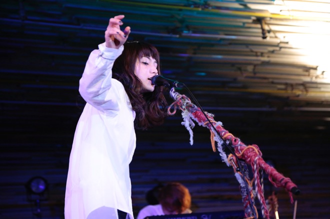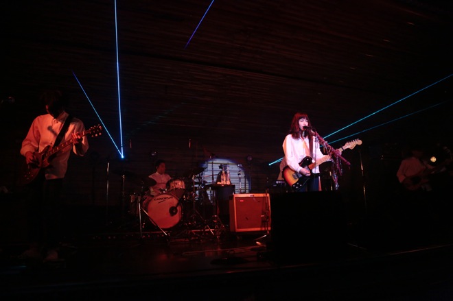 BGMが絞られ、フィルムが回る音とともにステージ上の白幕に映し出されたのは子供部屋の風景だ。ほの暗く柔らかなランプの光に照らされたベッド、物語を読み聞かせる母親の声。そしてSEがスぺ―シーなものに切り替わり、“ツーツツツーツー”というモールス信号が響くと、ステージにバンドメンバーが登場、最後にゆっくりと植田真梨恵が姿を現した。