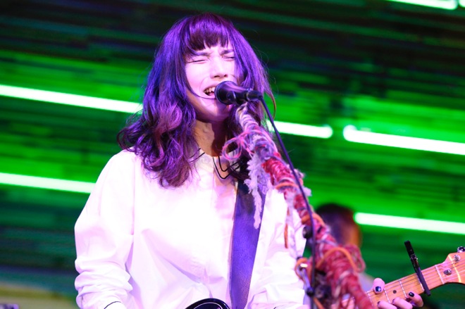バンドがステージに戻ると「I was Dreamin’ C U Darlin’」へ。アウトロでは楽器がひとつずつ抜け、最後に残された植田のハミングが静かに空間に消えていく。すると突然、ウエスタン風のSEが流れ、照明が落ちた。再び照らされたステージには、テンガロンハットをかぶった植田と馬のマスクをつけたギタリストが。出発を叫ぶような陽気なかけ声からアコギをかき鳴らし「WHO R U ?」へ。植田の笑顔がとにかく楽し気。ギターとピアニカがユニゾンで競うような旋律に歓声が上がる。その後も「パエリア」をモチーフに、野菜のレプリカをキャッチボールしたりとハッピームード。