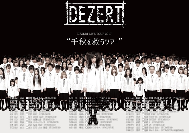 DEZERTが2月15日の池袋 Black Hole公演を皮切りに<DEZERT LIVE TOUR ”千秋を救うツアー”2017 >をスタートさせた。同ツアーの追加公演が開催されることが発表となった。