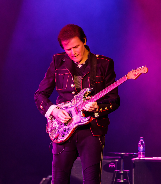 よってこの3人のLIVEはTrevor Rabin寄りのポップなYES、ということになるのか、と思っていると、2曲目からはいきなり3枚目のアルバム『The Yes Album』から「Perpetual Change」、そして再び『90125(ロンリーハート)』から「Hold On」、そして『The Yes Album』からの「I’ve Seen All Good People」と大ネタとポップサイドをバランスよくちりばめている。それぞれの曲でJon Andersonの声は申し分ないほど伸びやかであり、やはりYESワールドにこの高音は必要不可欠だ。そしてマント姿は昔と同じだが、過去のアナログキーボードとはあきらかに違うRick Wakemanのサウンドは、丁寧な指弾きを多様したフレーズを中心とした彼独特のものであり、過去をなぞるのではなく、今の時代のRick Wakemanならでは、だ。またTrevor Rabinのギターはスタジオワークを多く経験しているせいか、必要以上にでしゃばらない、サウンドに溶け込んで全体を引き立てるタイプのもので好感がもてる。