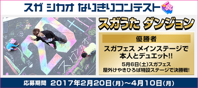 このコンテストのグランプリ受賞者は、5月6日にさいたまスーパーアリーナで開催される「SUGA SHIKAO 20th Anniversary スガフェス!~20年に一度のミラクルフェス~」のメインステージにおいて、スガ シカオ本人と一緒にデュエットができる。スガフェスは、室内型ロックフェス「VIVA LA ROCK」とコラボレーションしており、数万人規模の動員が予定される大規模なもの。