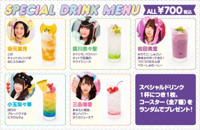 メンバーはそれぞれの担当カラーのドリンクをプロデュース。そのほか今作「ゆうめいに、にゃりたい。」の歌詞からインスパイアされたフードやドリンク、すべて新作メニューがラインナップされている。