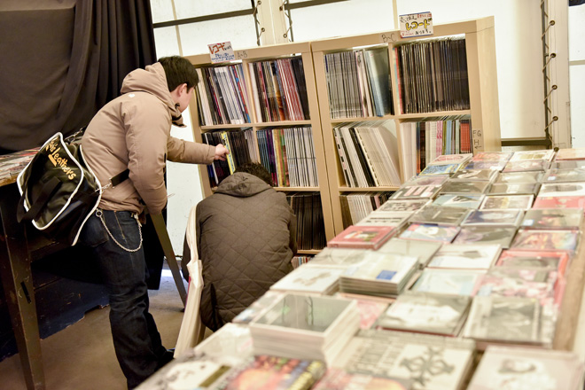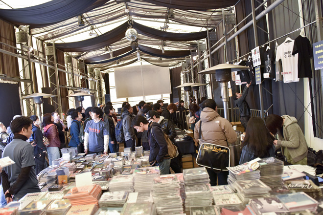 もうひとつ、会場敷地内の屋外に設けられた「Hostess Club Shop」という名のガレージショップ。“One buy get one free”や“3 for £10”とどこかに書いてありそうな狭い店内には、レコードやCD、テープがギッシリと積み重ねられるように並べられ、それに負けないくらいぎゅうぎゅうに押し入った客たちが黙々と掘り進めるという音楽愛で充ち満ちたちょっとしたカオスは、見ているだけでハッピーになれました。