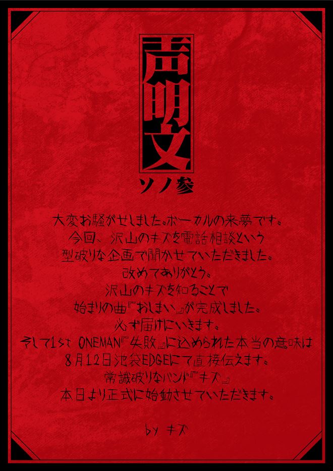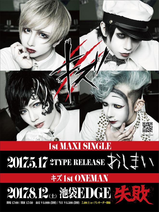 電話相談にお茶目なひっかけ看板と始動前から話題を提供してくれるキズ。彼らは5月17日(水)に1stマキシシングル「おしまい」をリリース、8月12日(土)には早くも池袋EDGEにて1stワンマン<失敗>を行うことも決定している。なお、お披露目ライブは4月18日(火)に新宿ReNYで行われる<MIND V主催 『V霊 -ブイダマ- vol.1』>にて。