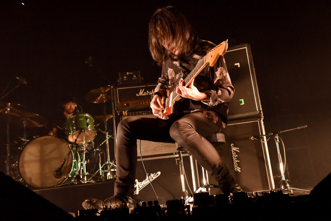 さて、肝心のライブはと言いますと、ベートーヴェンの「月光」が流れる厳かな雰囲気となったステージへメンバーが登場し、闇を切り裂くように奏でられた「Ashes in the Snow」で一気にMONOの世界へと誘われ、耳を懲らせば轟音の中に存在する美しくも儚いメロディが心に響き届く彼らの申し子たちが、現行のワールドツアー内容と大きく変わることなく披露されました。
