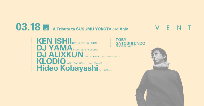 3月18日に表参道VENTにて行われるススムヨコタの3回忌イベント<- A Tribute to Susumu Yokota 3rd Aniv. ->。