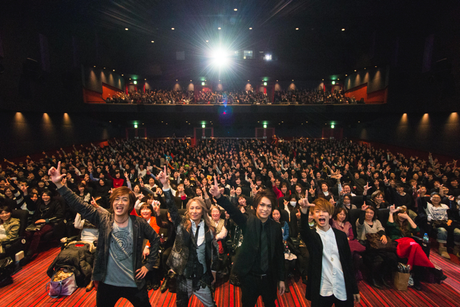 この「シアターライブ」とはライブ映像を流すのはもちろん、トークショーやゲーム、そしてライブ同様歌って踊って楽しむことができる体感型映像イベント。当日は映画としてライブを楽しむのはもちろん、ライブ映像中の「舞哈BABY!! -WooHa-」と「恋のFRIDAY!!!」では観客がルミトンライトをもちライブさながらに盛り上がる光景も見られた。さらにイベント中盤には「GACKT JOB」と呼ばれるバンドメンバーも登場しMCのVAL(Dr)を中心にCHACHA(Gt)YOU(Gt)SATO(Ba)と共に<LAST VISUALIVE>を振り返った。
