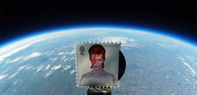 英国の郵便事業Royal Mailは、デヴィッド・ボウイの特別切手発売を記念し、ボウイの映画『地球に落ちて来た男』にちなみ、それらを宇宙に打ち上げた。