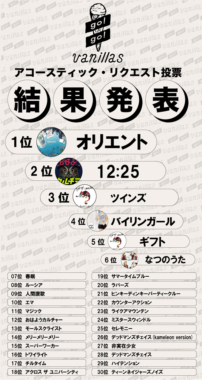 go!go!vanillas、<アコースティック・リクエスト>投票結果発表