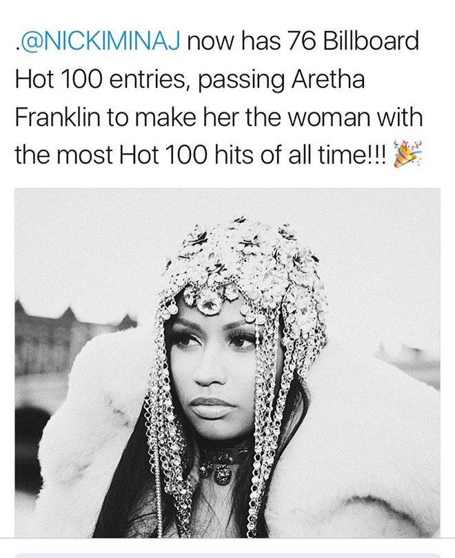 ニッキーは2月終わり、それまでの最多、アレサ・フランクリンの73曲にあと一歩の72曲まで迫り、今月初めにGucci Maneとの「Make Love」が78位に入ったことから、アレサの記録に並んだ。