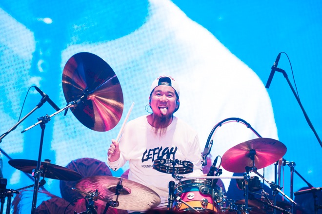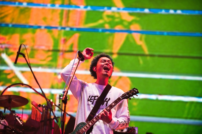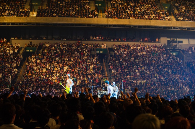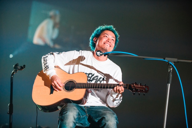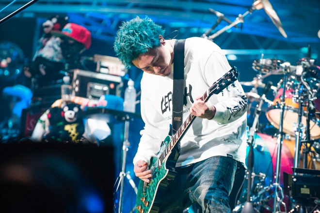 「多分初めて見る人もいると思うので、自己紹介します。東京都在住、熊本出身、谷間でーす」(KENTA)、「見た──い!」(FUJI)、「WANIMAでーす」(KENTA)と、合間、合間でネタを放り込んだり、元大関の把瑠都から“WANIMA兄さん”宛に祝福のビデオレターが届き、「昨日の歌」の曲振りまでしてくれたりと、随所で遊び心がふんだんだ。本人たちも言っていたが、何しろWANIMAは1曲が短い。「Hey Lady」や「昨日の歌」などは1分ほどの曲でもある。この日は、曲数もたっぷりなのはもちろん、普段以上に個性豊かなWANIMAの3人のキャラクターを味わえそうなセットリストであり、内容のようだ。