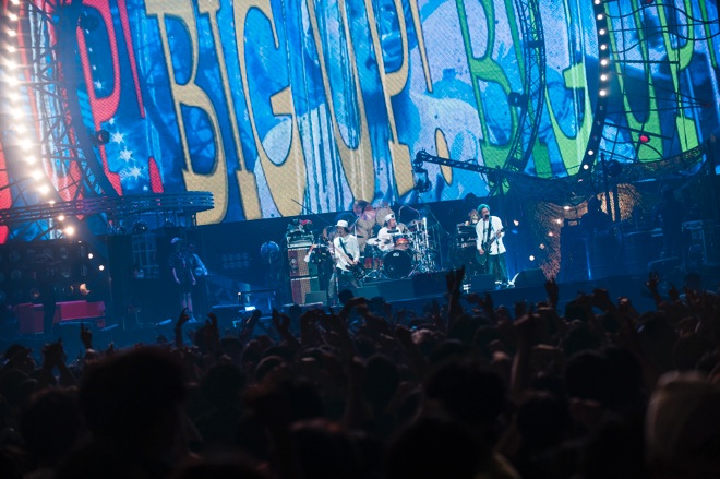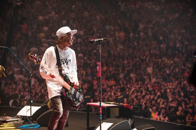 「Japanese pride」や「1CHANCE」「夏の面影」「BIG UP」など、前半はレゲエやファンクの気持ちのいいタメの効いたパンクチューンが中心で、観客は大きくジャンプし、またタオルを振るう。スタンディングのエリアでは、大きなサークルも出現して汗を飛ばしている。疾走感のあるアグレッシヴなサウンドだが、メロディアスで歌もののパワーが強いWANIMAの曲は、大きなアリーナ会場でもよく映える。