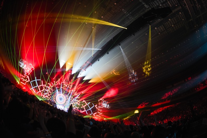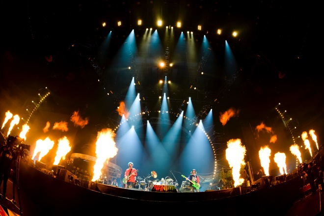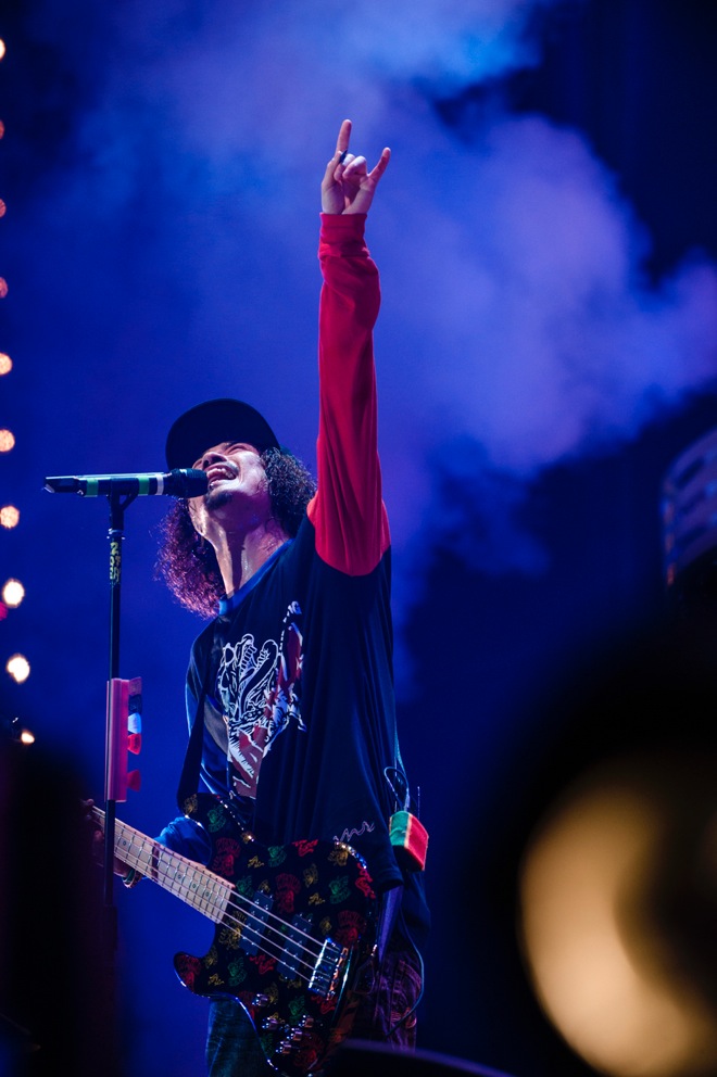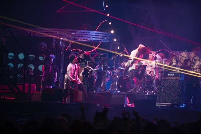 KENTAのこの言葉から、会場一体の「ともに」の大合唱が起こる。“♪火を灯せ”と力強く歌う「リベンジ」では、ステージから豪快に炎が上がる。「Hey yo…」「1106」と、このブロックでは、ラウドなサウンドとともにぐっと強く背中を押す曲から、郷愁を誘い、大事な場所や人を思い出させるエモーショナルな曲とで、涙腺を刺激した。そして、会場にいるひとり一人に語りかけるように、「このまま帰りたくないし、帰したくない」「そろそろ、踊る時間じゃない?」と「オドルヨル」〜SMAP「夜空ノムコウ」〜「いいから」というつなぎで、踊らせ、歌わせ、フロアをカオスと化していった。