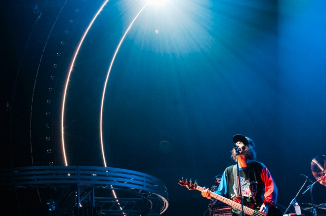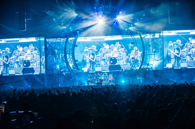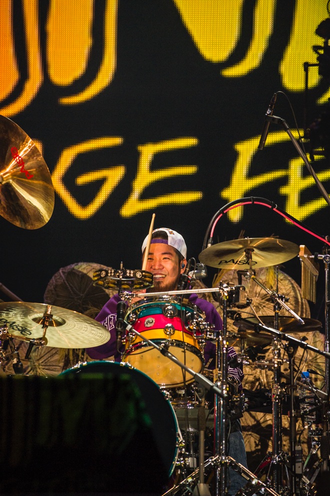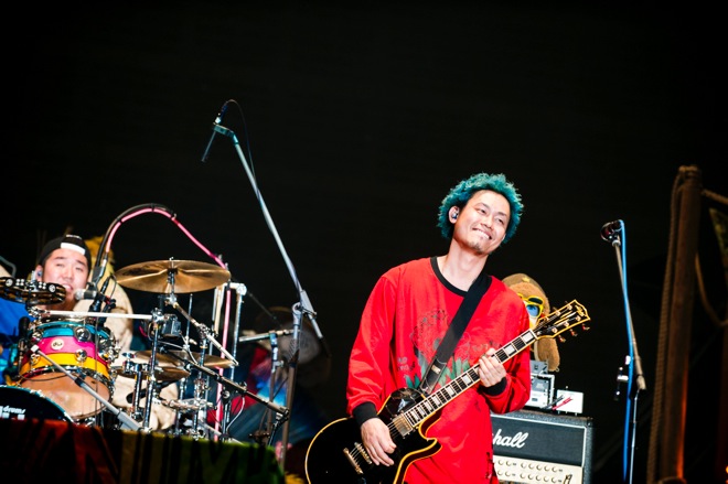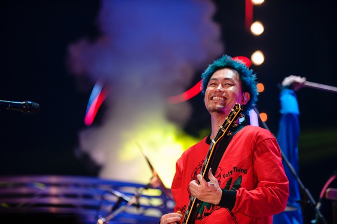 1曲目の「Hey Lady」でファンファーレのように紙テープがスパークし、会場が一気に明るさを増して、歓声も大きくなった。「みんな飛ばしすぎじゃない?!」(KENTA)と言いながらも、「雨あがり」「つづくもの」を連投。ステージには大きな照明の装置のほか、たっぷりとワイドなヴィジョンが会場後方までメンバーの姿を大きく映し出していく。KO-SHIN(G)もFUJI(Dr)も笑顔で、走りがいのある左右に伸びたステージを、KENTAは楽しそうに走り回る。