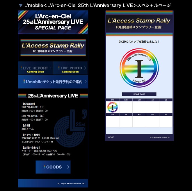 L’Arc-en-Cielが4月8日(土)および9日(日)の2日間、東京ドームにて<25th L’Anniversary LIVE>を開催する。これを記念して特設サイトではWeb企画『Mission L’Arcollection』を展開中など続々と賑わいをみせるなか、本日3月29日よりオフィシャルモバイルサイトL’mobileにて『L’Access Stamp Rally』企画がスタートした。