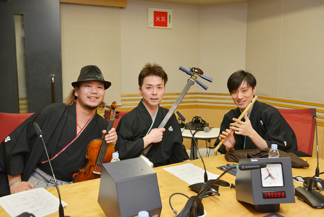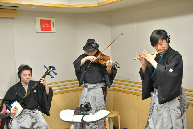 竜馬(Vn)、雅勝(津軽三味線)、翠(篠笛)のメンバー3人が登場した同放送では、リスナーから募集したキーワード“入学おめでとう”“交通渋滞”からイメージした即興演奏を含む生演奏も披露された。