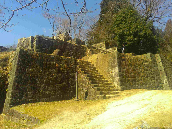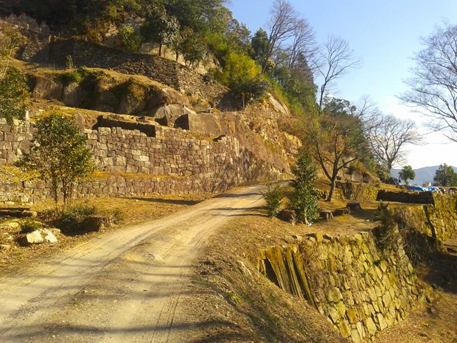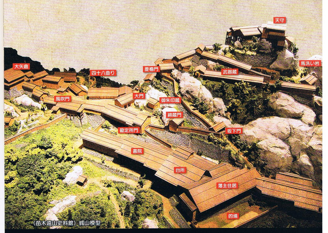 苗木城は432mの山に建てられている。木曽川と山の田川を天然の堀にした元祖山城である。現在は資料館側が大手とされているが、築城当時、江戸時代半ばまでは三ノ丸の風吹門と真逆にある竹門側が大手であった。この道は四十八曲がりと呼ばれており、その名の通り48回曲がくねりながらの道になっている。まさにTHE LONG AND WINDING ROADだ。この下に山の田川が流れており、そこに大手門があったとされる。この道を行けばわかるさと猪木さんも言っているが、かなりの勾配である。城を攻めるにはこの道を登らなければならないと考えたらすでに守りは頑丈だ。現在の大手側に御殿があったわけなので本来の城の裏側に生活する空間を造り、大手は険しく、という防御が伺える。強面の人が髭を剃ると意外と童顔というのに似ている。しかもこの四十八曲がり、途中にはしっかりと石垣が施されており、城マニア必見である。苗木城を紹介する写真はこの四十八曲がりの石垣がない。これはもったいない。是非三ノ丸から下ってみるのも良し、もちろん麓の大手門跡から登るのもお勧めである。