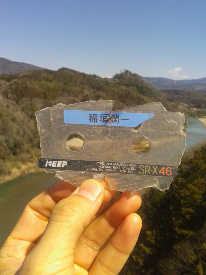 苗木城がある中津川は「栗きんとん発祥の街」ということで駅前の物産展で歴史ある和菓子屋の栗きんとんを食べてもらいたい。ただ飲み物がないと栗きんとんは口内の水分を取られる、乾いた栗きんとんに掻き消されて最後の声も聞こえない状態になるのでご注意願いたい。B-BLUEではなく岐阜の頭文字を取るとG-BLUEになりかねない。駅構内にある立ち食い蕎麦も岐阜ならではの濃い出汁の汁が非常に美味かった。このコラムでも紹介したが、岐阜県の名城として岩村城も鉄板、もちろんこの苗木城も鉄板である。これはもはやセットだ。こんな2トップはない。DARYL HALL&JOHN OATES、もしくはSIMON&GARFUNKELくらいの2トップと言えるだろう。ぶっちゃけこのどちらもそんなに好きじゃない私はどうしたらいいんだろうか?小堺一機と関根勤のコサキンと言った方が私的には超しっくりくる。彼等二人が昔コンビだったことを知るのは我々の世代でギリだろう。最後に苗木城の最高な写真スポットをお伝えしよう。城の近くに架かる木曽川を渡る橋がある。城山大橋という橋からの苗木城の眺め、これは本当に素晴らしい。今でこそ天守の懸造と大矢倉の石垣が若干見える程度だが、ここに壁が土壁、もしくは板張り。屋根は板葺きの切妻造り、清水寺のような懸造りの城がそびえていたとイマジンすると鳥肌ものだ。こないだtvkさんの私の城番組のロケで来城した時にここで写真を撮ったのだが、足元を見るとこんな物が落ちていた。なつかしの46分テープだ。しかも「稲垣潤一」と記載してある。稲垣潤一さんの曲を編集したBESTっぽい。なんでこんなところに捨ててんだ。だが敢えて、そこは敢えて、もう一度この橋の歩道に、もう一度このテープの破片をそっと置いた。そしていつかまた取りに来ようと思う、そう、クリスマスキャロルの頃には、取りに来ようと思う。