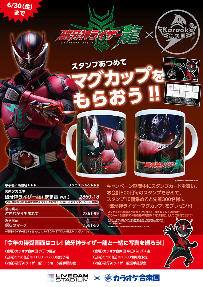 そんな「破牙神ライザー龍」とカラオケ合衆国によるコラボキャンペーンは、仙台六丁の目店・仙台中田バイパス店・石巻店の3店舗で実施。まずはスタンプカードをもらい、お会計500円毎にゲットできるスタンプを集める。スタンプ10個になると「破牙神ライザーマグカップ」がもらえる。マグカップは先着300名限定なので、欲しい人は早めに行動しよう。