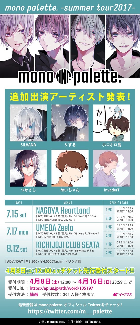 4月2日の新宿ReNYワンマンでも盛況ぶりをみせ、夏ツアーに突入するmono palette.。東名阪開催となる<mono palette.-summer tour2017->では各公演ごとに異なる2組の歌い手がmono palette.と共にライブ参戦する。7月15日の名古屋HeartLand公演には「ホロホロ鳥」「つかさし」が、7月17日の梅田Zeela公演には「めいちゃん」「InvaderT」が、8月12日の吉祥寺CLUB SEATA公演には「りする」「SILVANA」が出演予定となっている。