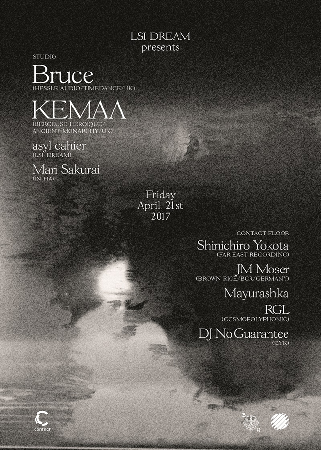 “RAW”をキーワードに90年代レイヴやマシンテクノ/ハウスの再興を経たUKベース新世代のハイブリッドなベクトルをひた走る<LSI Dream>が、シーンの中核レーベルとなっている “Timedance”や“Hessle Audio”からのリリースでおなじみ、ブリストルのプロデューサーで若手最注目株のBruce、 そして音源のみならず背徳的なアートワークで物議を醸してきたロンドンの異端レーベル“Berceuse Heroique”主宰のKEMAΛ(ケマル)をゲストに迎える。