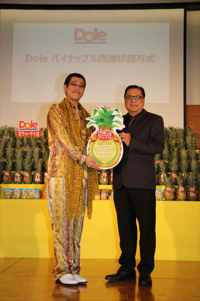 ピコ太郎が4月11日(火)、バナナやパイナップルの販売を行なっているDoleより感謝状を受け取った。