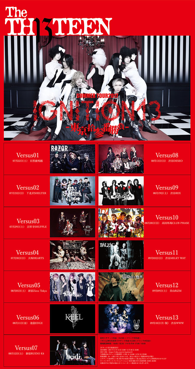 13日間にわたって開催されるこの2マンライブには、RAZOR、Mix Speaker’s,Inc.、ザアザア、DADAROMA、FEST VAINQUEUR、KEEL、heidi.、HERO、グリーヴァ、ダウト、BALZAC、怪人二十面奏、LM.Cといった個性豊かなバンドが集結。いずれのバンドも独自のカラーを持つ個性的なバンドなので、13日間それぞれ毎回違ったThe THIRTEENとの化学反応を見せてくれることだろう。