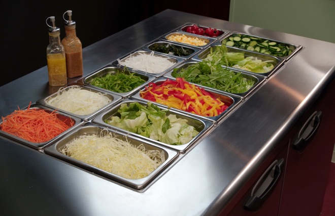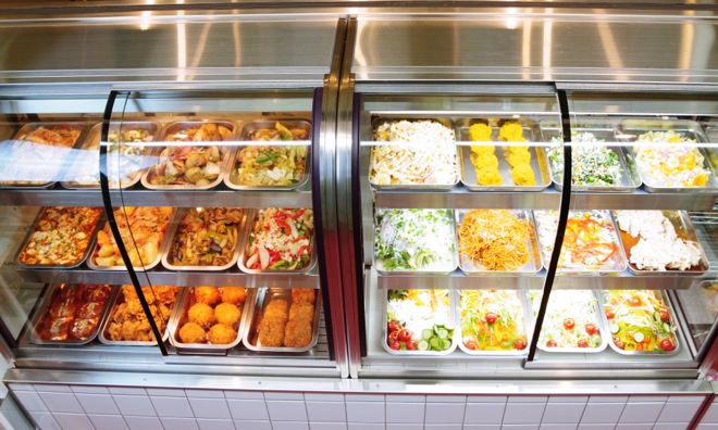 コンビニとしては、生活の最低限を押さえるスタンダードなアイテムを選定し、デリとしては12品目のサラダバー、量り売りの約20品目の温製・冷製惣菜や揚げ物を配し、ご飯とのワンプレート/パンに挟んでなど、それらを自由に組み合わせることができるという。