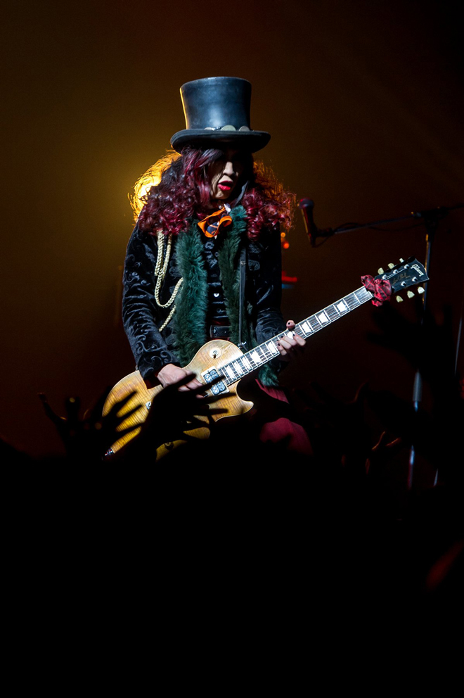続いてライヴでおなじみの「毒女」で妖しい雰囲気を撒き散らし、サトシがレスポールで激しくもエモーショナルなソロを奏で、前半で早くも未発表の新曲「Don’t Break my love」が投下された。ライヴ映えするアッパーチューンにハンドクラップで盛り上がるオーディエンス。