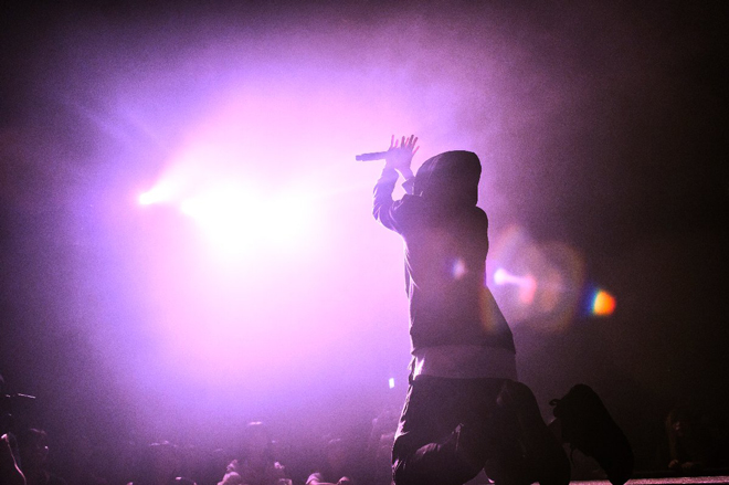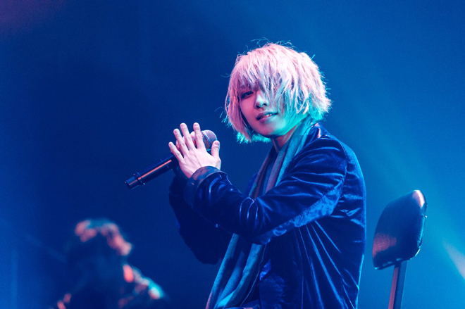 第2部と言ってもいいセクションに位置する「THE END」はオープニングのように再びステージに沙幕がかかり、歌詞が映し出される中、演奏される演出。続いて披露されたデビューシングル「MOON LIGHT DOWN」で幕が落ちると悠希は黒のパーカーのフードを目深にかぶったカジュアルなスタイル。スモークがたかれる中、花道で膝まづいて歌う悠希は全てをむき出しにしたような激しい歌で見る者を釘づけにし、「もっともっと激しくいこうよ」と「ラビリンス」、「Punishment」とヘヴィなナンバーを立て続けに投下していった。