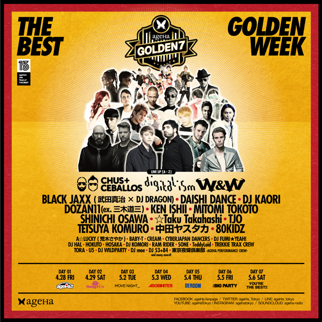 4月28日(金)から5月6日(土)までのゴールデンウィークの間、新木場ageHaにて<THE BEST GOLDEN WEEK!!>のテーマのもと、連日パーティーイベントが開催される。