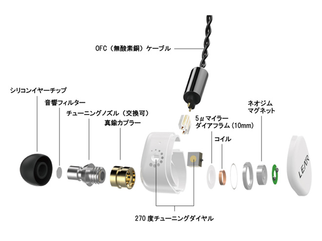 今回発表されたイヤホンは、270度チューニングダイヤルで低域の調節が可能となっており、別売の「アドバンスノズル」に交換する事で中高域の調節もコントロールできるようになる。N40ネオジムダイナミックドライバーとOFC(無酸素銅)ケーブルを起用し、程良い厚みのあるクリアな音質を実現しているという。