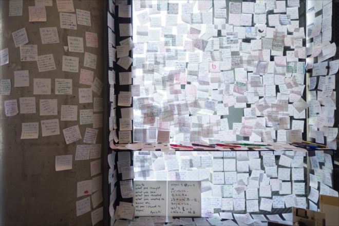 坂本龍一への質問とその回答に対して投稿者がまた返信のポストイットを貼るなどコミュニケーションの場が成立していたり、9歳の少年と坂本龍一とのやりとり、世界中からの外国語の投稿など、豊かでバラエティに富んだスペースになっている。SNSなどネット上でのテキストベースでのやりとりが主になった現在のコミュニケーション状況の中で、来場者ひとりひとりの手書きのメッセージという物理的な質感は、見る人すべてになにかしらの感慨を与えている。