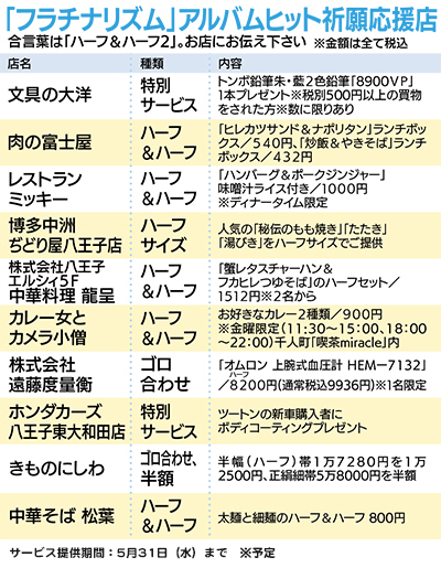 内容は、参加店舗で「ハーフ&ハーフ2」と合言葉を言うと、それぞれの店舗オリジナルの“ハーフサービス”が受けられるというもので、発起人は八王子フラチナ族(ファンクラブ)の隊長・馬場眞由美さん。メンバーや事務所からの依頼ではなく、ファンが主体となって行なっているというのだから驚きである。