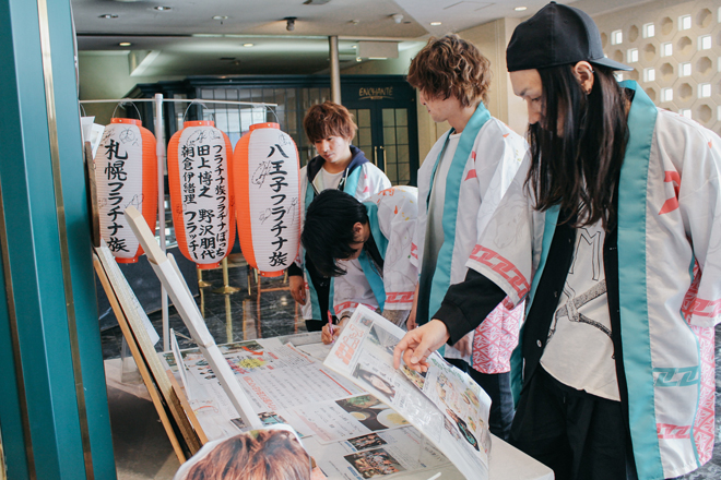 インタビューを終え、店舗の前で記念撮影。建物内一階の正面入口に設置されているフラチナリズムコーナーへ移動すると、2016年11月に行なわれた東京・中野サンプラザホールワンマンでステージ上に飾られていた提灯や、ライブ・イベント出演情報、テレビ番組で取り上げられた際の画面を撮影した写真など、想像を遥かに超える展示品の数々が迎えてくれた。愛されてるなあ。自由にコメントを書くことができるノートも置かれていて、モリとタケウチがメッセージを残してきたのでぜひチェックしてほしい。