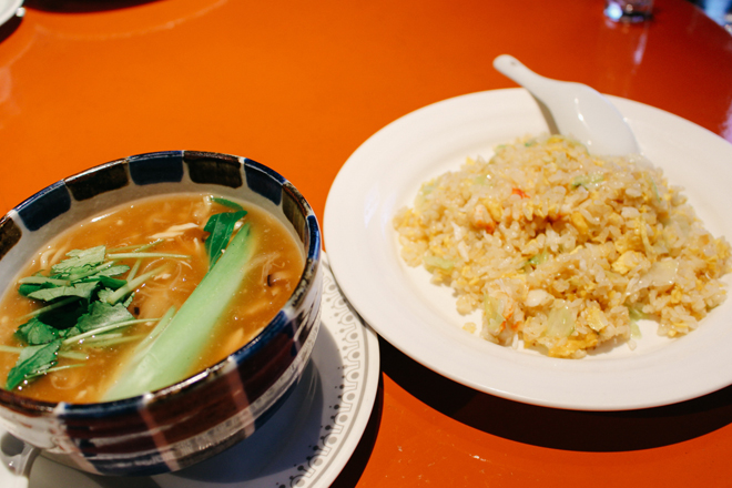 提供されるサービスメニューは「蟹レタスチャーハン&フカヒレつゆそばのハーフセット(1,512円・税込)」。モリがメニューを読み上げると「フカヒレが出んの…!?」と普段はクールな田村もテンションが上がってきたようだ。食事が到着すると「すごい!」「フカヒレきた!」「ハーフでこんなにボリュームたっぷりなの!?」「こんないい仕事あるんだな……」と大興奮の4人。