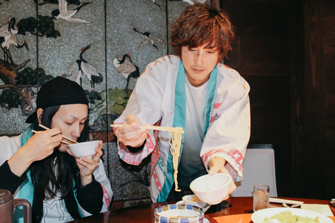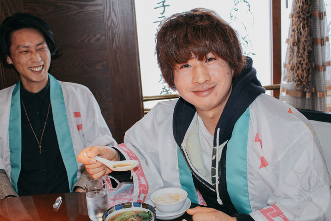 「どこにフカヒレいるの〜?」と言う都築に「その緑のやつ(付け合せの野菜)だよ」とタケウチ。「あ、この緑のがフカヒレか!」と天然っぷりが炸裂し「そんなわけねーだろ」と3人から総ツッコミが入る。そんな都築は「塩気が好き、バランスがすごい」「麺がすごい」とお気に召したようでニコニコしながらフカヒレつゆそばを口に運ぶ。また、モリは「蟹めっちゃでかいやん」「これおかずに白メシいけるね」と蟹レタスチャーハンにも舌鼓。4人は見事な食べっぷりを見せ、あっという間に完食となった。