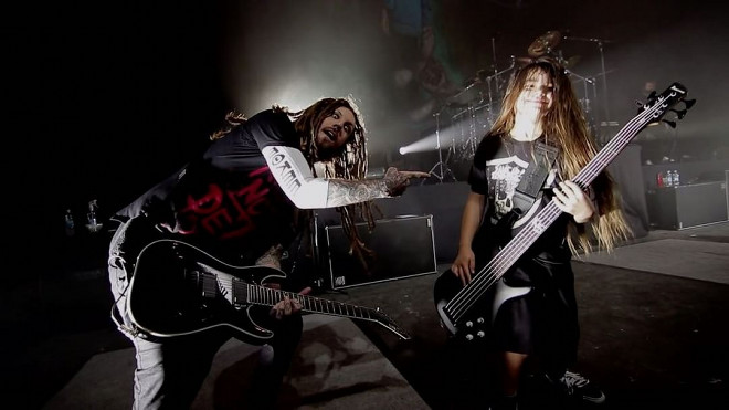 コーンのフィールディ(B)が、参加できなかった南米ツアーで彼の代理を務めた、メタリカのロバート・トゥルージロの12歳の息子Tye君を称えた。
